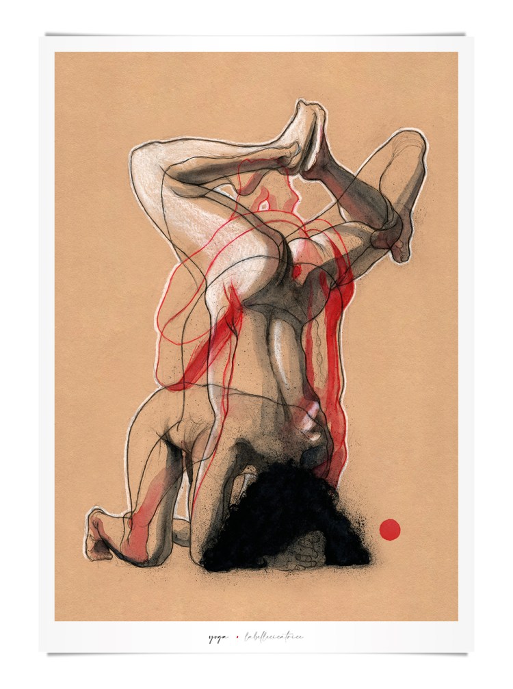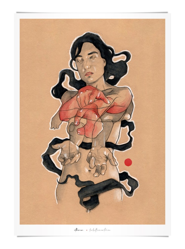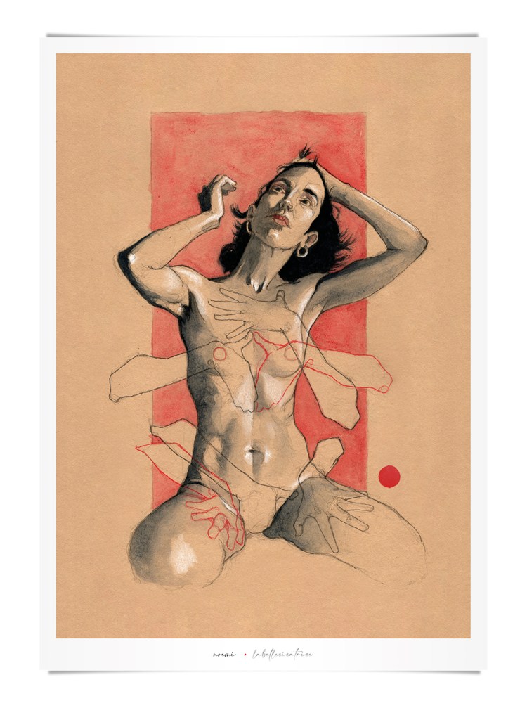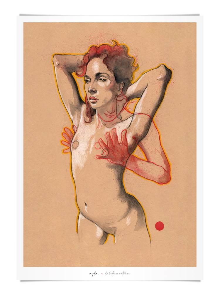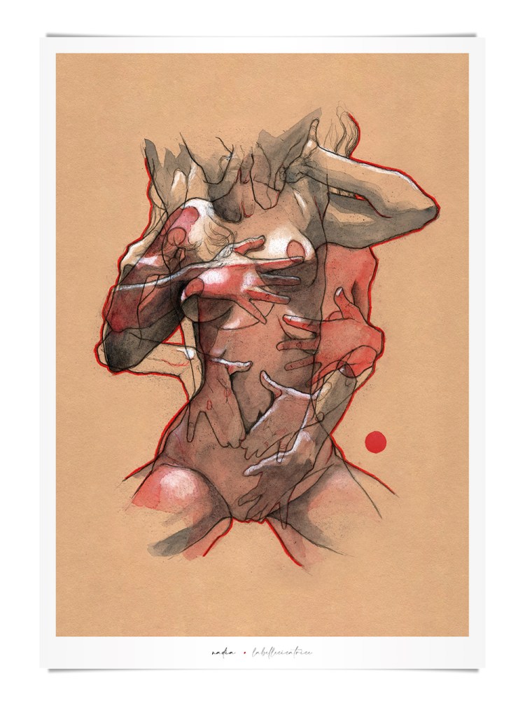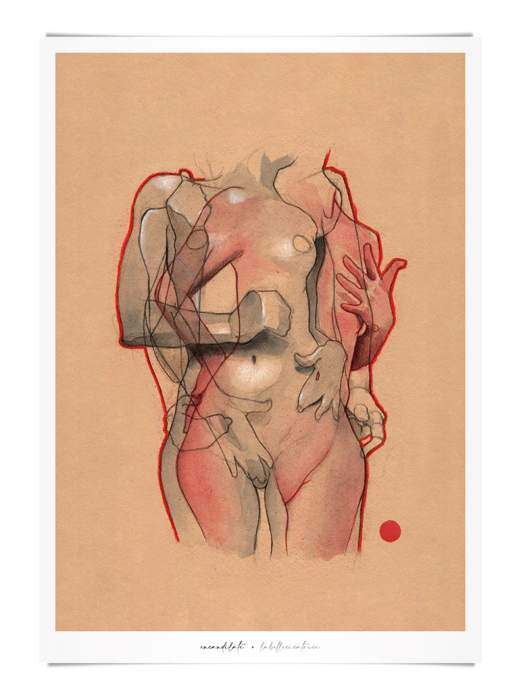 Movement, color and eroticism are liquid. Movement in multiple poses, arms and hands running across the skin, invisible dances. Color that dilutes in the mother liquid and ends in the rectangular paper, the skin of art. Eroticism that creates liquid, flows that embrace and transport pleasure. A triangle of elements that closes the circle of liquidity.