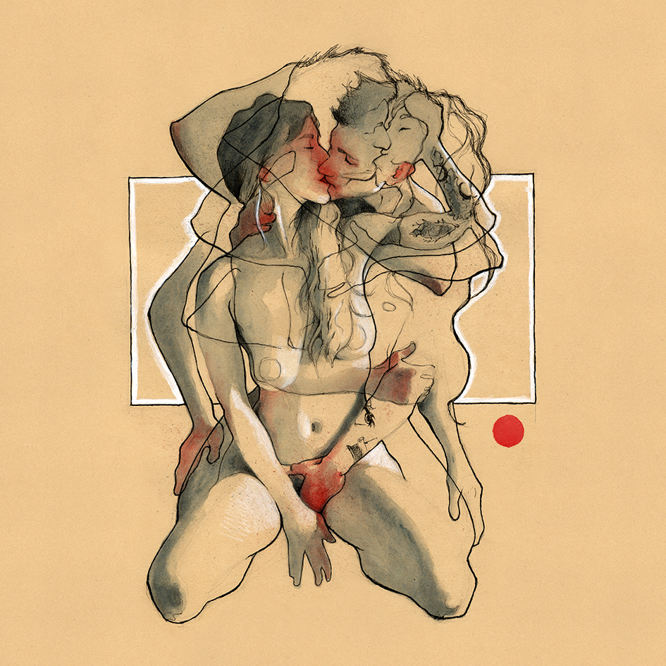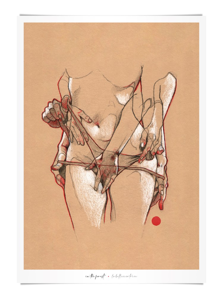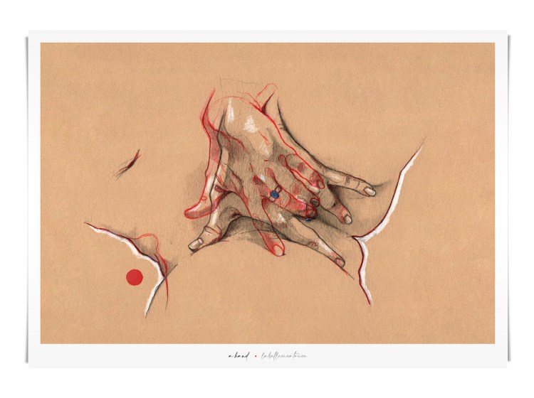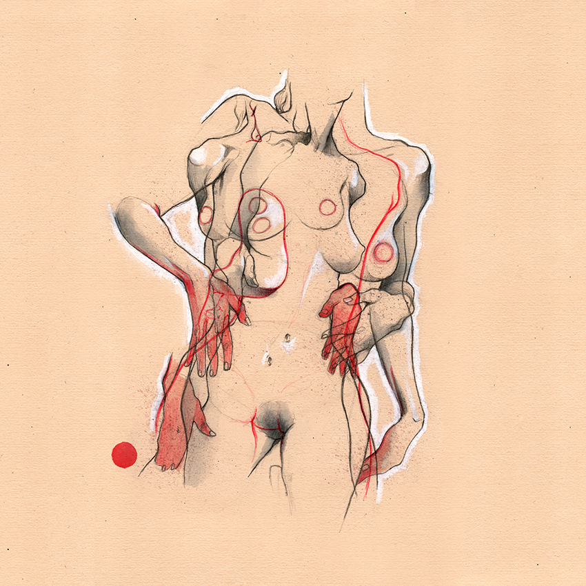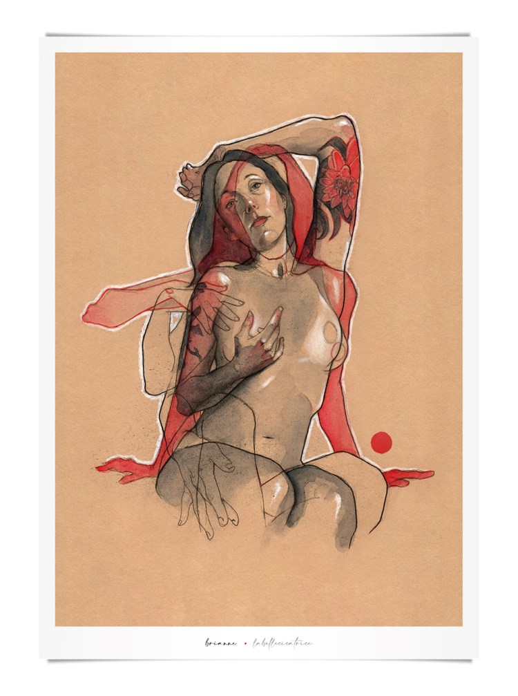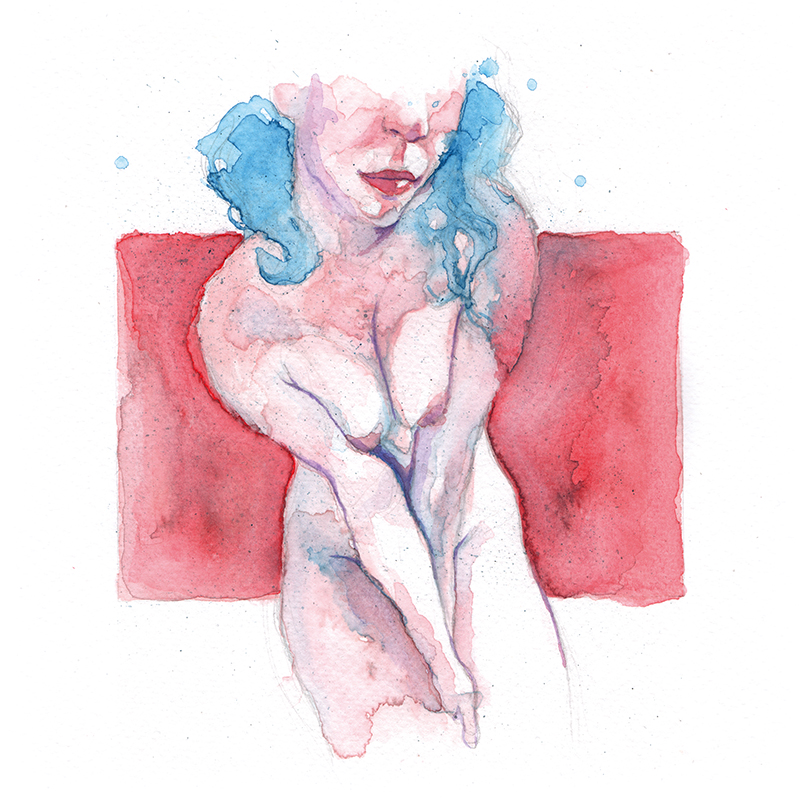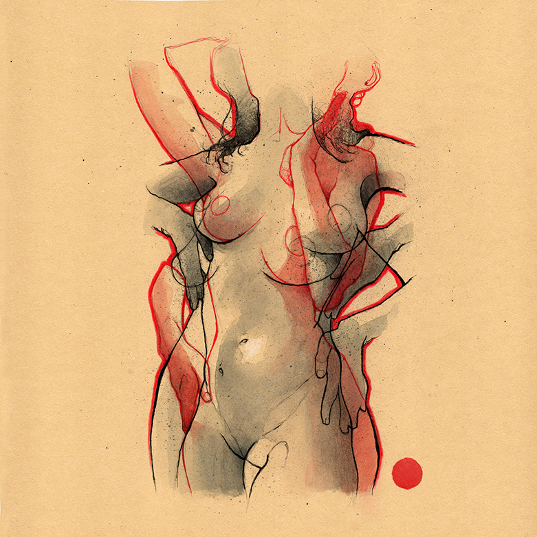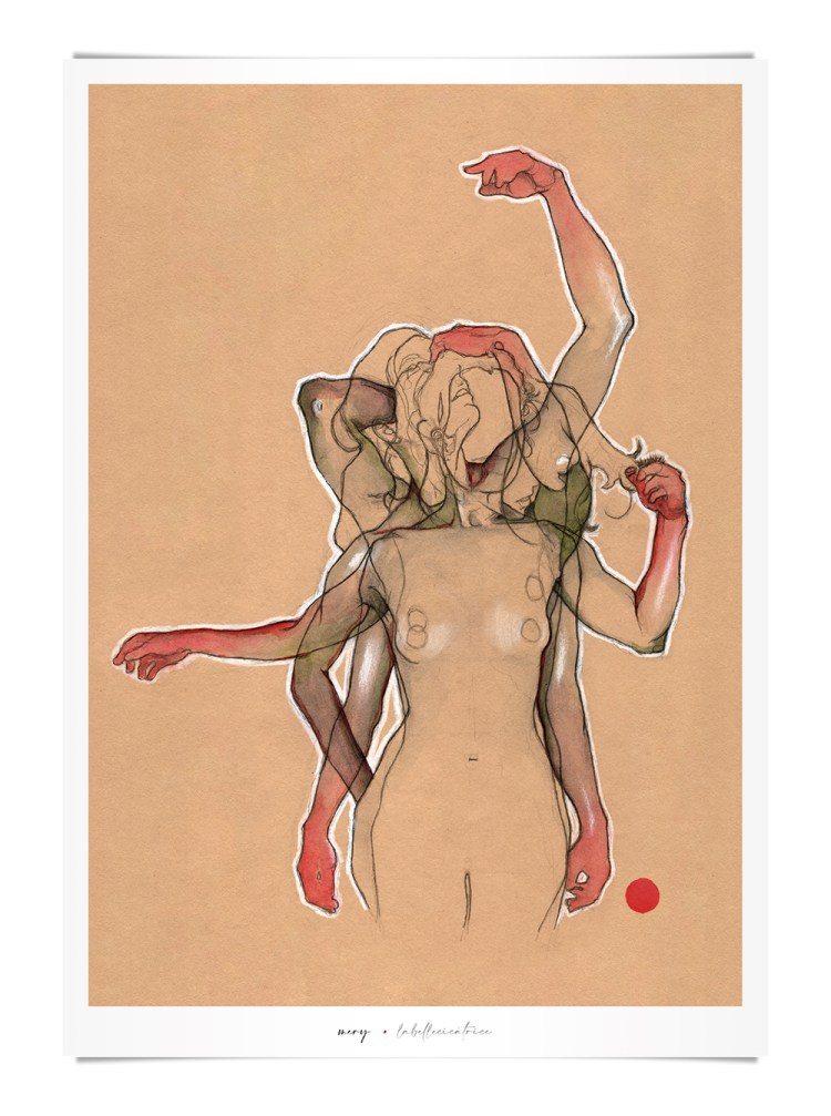 Movement, color and eroticism are liquid. Movement in multiple poses, arms and hands running across the skin, invisible dances. Color that dilutes in the mother liquid and ends in the rectangular paper, the skin of art. Eroticism that creates liquid, flows that embrace and transport pleasure. A triangle of elements that closes the circle of liquidity.